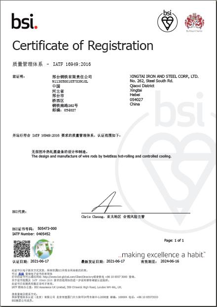 - In June, Xingtai Iron and Steel Corp., Ltd. (hereinafter referred to as Xingtai Steel) successfully passes the recertification of QMS IATF 16949 (including IATF 16949:2016 and ISO 9001:2015) after being audited by third-party certification body BSI. So far Xingtai Steel has passed the Automotive Q…