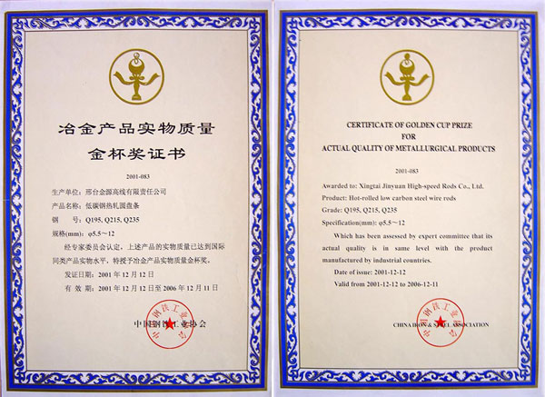 低碳鋼熱軋圓盤條Q195,Q215,Q235獲冶金產(chǎn)品實(shí)物質(zhì)量金杯獎