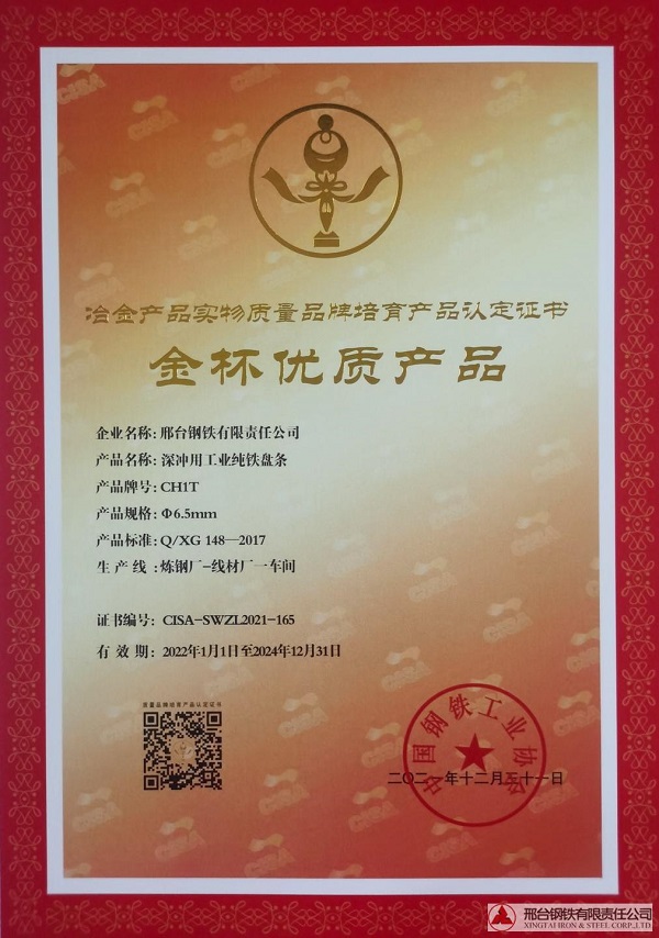 深沖用工業(yè)純鐵盤條CH1Tφ6.5mm規(guī)格獲冶金產(chǎn)品實(shí)物質(zhì)量金杯優(yōu)質(zhì)產(chǎn)品認(rèn)定證書