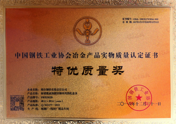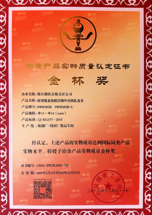 橋梁纜索熱鍍鋅鋼絲用熱軋盤條SWRS82B、SWRS82B-L Φ11~Φ14(mm)獲得冶金產品實物質量“金杯獎”