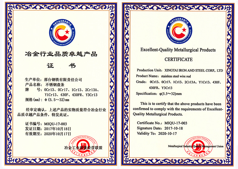 不銹鋼盤條0Cr13、0Cr17、1Cr13、2Cr13A、Y1Cr13、430F、430FR、Y3Cr13共8個牌號φ5.5- 32mm規(guī)格獲冶金行業(yè)品質卓越產品