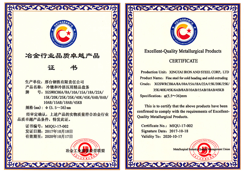冷鐓和冷擠壓用精品盤條XGSWRCH6A/8A/10A/15A/18A/22A/15K/20K/25K/35K/40K/45K/6AB/8AB/10AB/15AB/18AB/45KB共18個牌號φ5.5- 36mm規(guī)格獲冶金行業(yè)品質卓越產品
