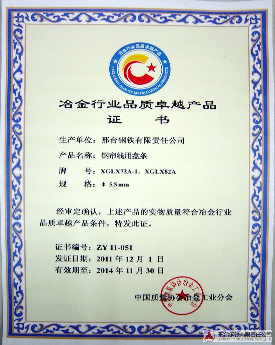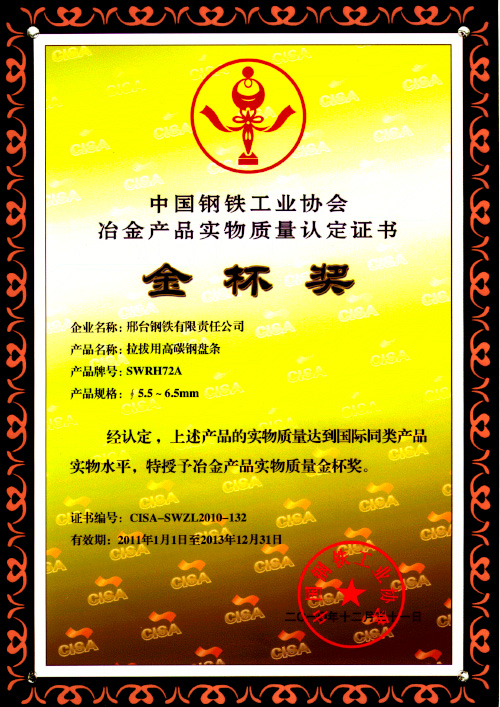 拉拔用高碳鋼盤條SWRH72A獲冶金產(chǎn)品實物質(zhì)量金杯獎