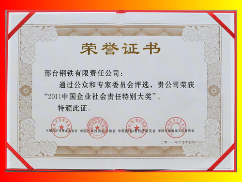 2011年6月17日,邢鋼被評(píng)選為“2011中國(guó)企業(yè)社會(huì)責(zé)任特別大獎(jiǎng)”。