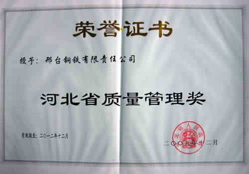 2009年12月,河北省政府授予邢鋼“河北省質(zhì)量管理獎(jiǎng)”。