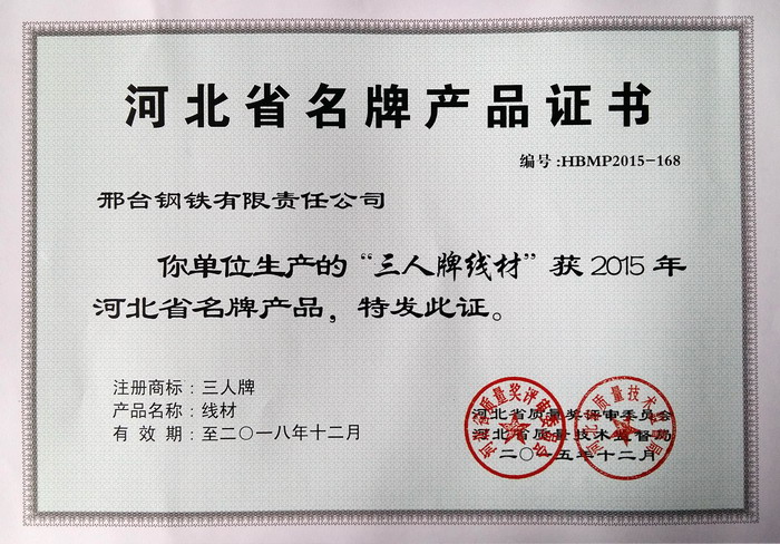 近日,邢鋼獲得了“河北省名牌產品”新證書,證書有效期至2018年12月。去年4月邢鋼按照河北省質量技術監(jiān)督局的通知要求再次申報復評,提交了申報材料,經邢臺市技術質量監(jiān)督局推薦、第三方專業(yè)評價、用戶滿意度測評、省質量獎評審委員會審議、社會公示并報請省政府批準,邢鋼“三人牌線材”再獲“河北省名牌產品”。