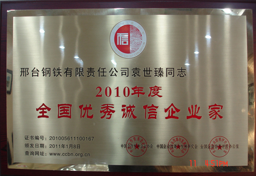 - 邢鋼榮獲2010年度“全國(guó)文明誠(chéng)信示范單位” 稱號(hào)