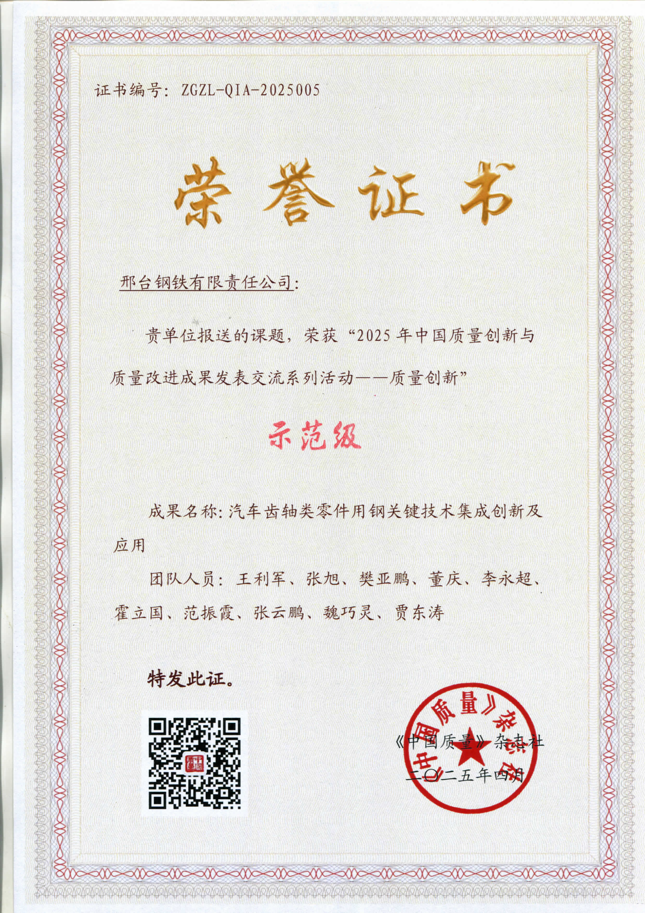 邢鋼團(tuán)隊(duì)榮獲2025年中國質(zhì)量創(chuàng)新成果“示范級(jí)”殊榮