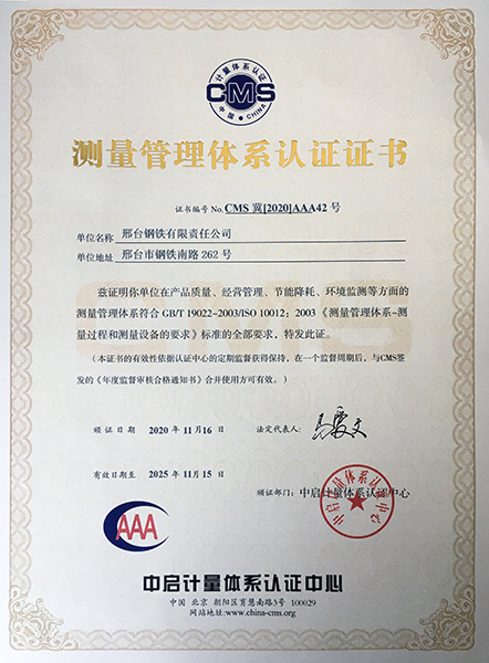 近日,邢臺鋼鐵有限責任公司(以下簡稱邢鋼)收到中啟認證中心頒發(fā)的《測量管理體系認證證書》,證書編號CMS冀【2020】AAA42號,證書有效期至2025年11月15日,證書的獲得標志著邢鋼測量體系認證證書順利實現(xiàn)換版。