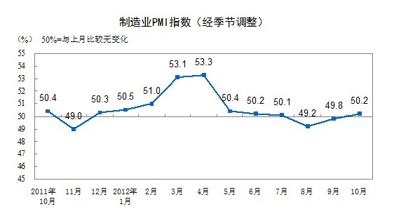 2012年10月,中國制造業(yè)采購經(jīng)理指數(shù)(PMI)為50.2%,比上月上升0.4個百分點,重新回到臨界點之上。