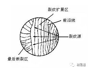 疲勞斷裂經(jīng)歷了裂紋萌生和擴(kuò)展過程。由于應(yīng)力水平較低,因此具有較明顯的裂紋萌生和穩(wěn)態(tài)擴(kuò)展階段,疲勞斷裂的宏觀斷口一般由三個(gè)區(qū)域組成,即疲勞裂紋產(chǎn)生區(qū)(裂紋源)、裂紋擴(kuò)展區(qū)和最后斷裂區(qū)。