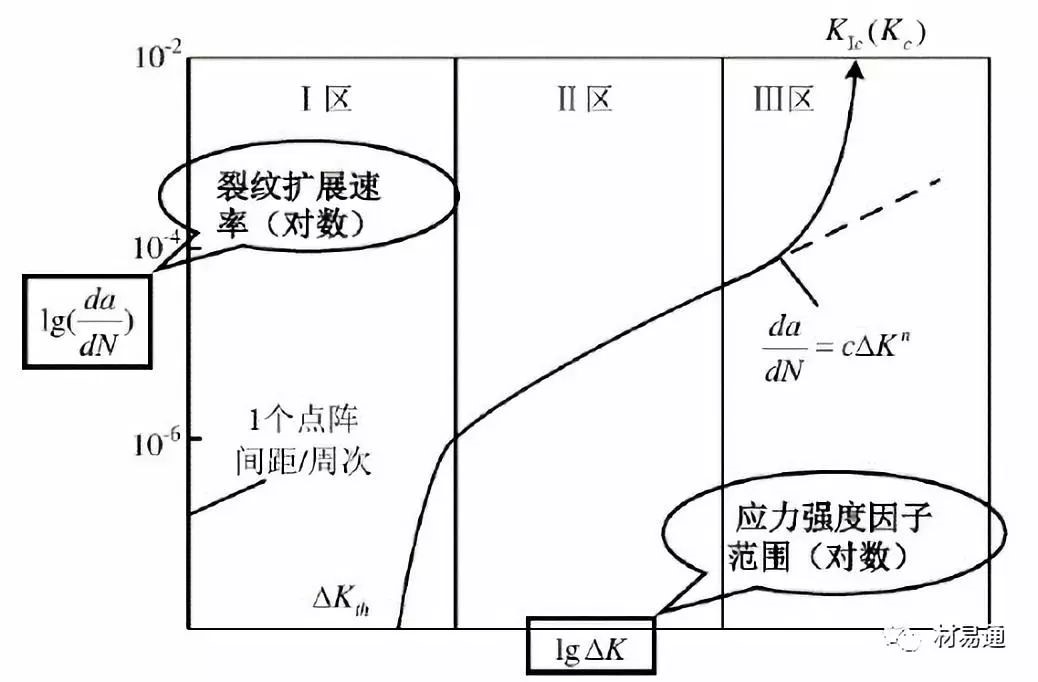 I區(qū):裂紋初始擴(kuò)展階段,10-8~10-6mm/周次,快速提高,但△K變化范圍很小所以提高有限;