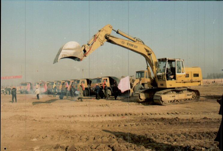 圖為1995年破土動工建設(shè)的場景,鞭炮的硝煙尚未消散,挖掘機(jī)抬起挖斗正要挖下第一鏟,運輸車整裝待發(fā),“煉鋼”來了!