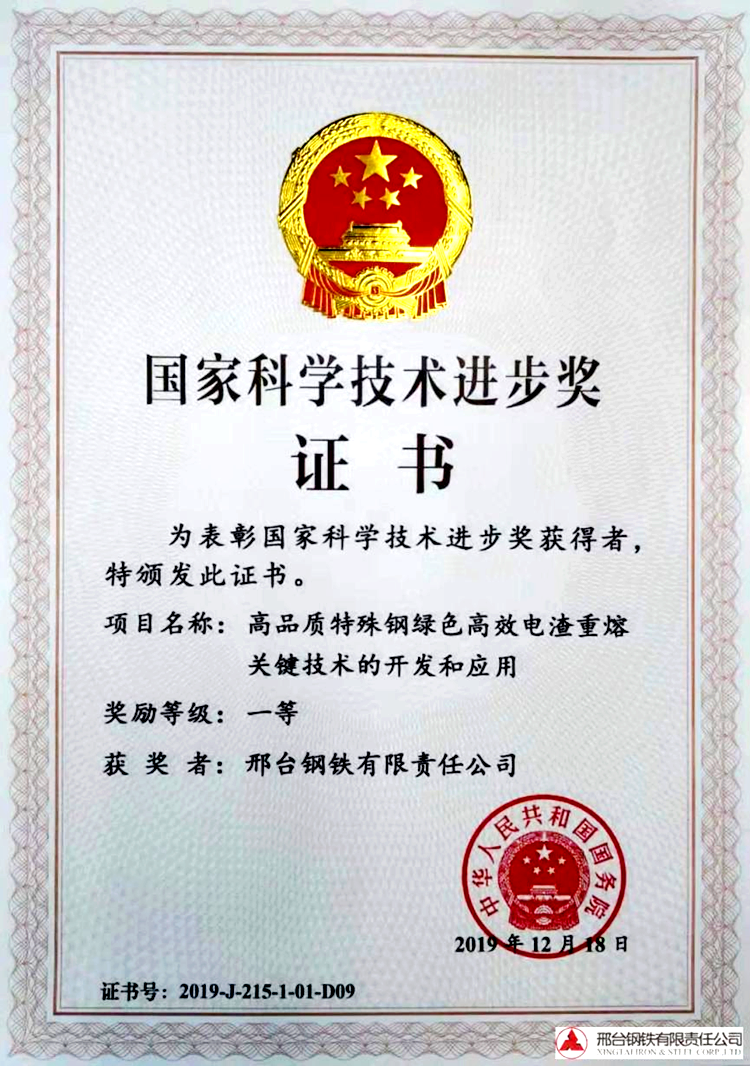 2019邢鋼“高品質(zhì)特殊鋼綠色高效電渣重熔關(guān)鍵技術(shù)的開發(fā)和應(yīng)用”還榮獲國家科學(xué)技術(shù)進(jìn)步獎一等獎。