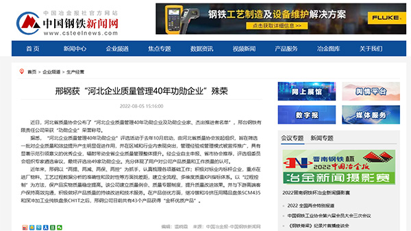 近日,河北省質(zhì)量協(xié)會公布了“河北企業(yè)質(zhì)量管理40年功勛企業(yè)及功勛企業(yè)家、杰出推進(jìn)者名單”,邢臺鋼鐵有限責(zé)任公司榮獲“功勛企業(yè)”榮譽(yù)稱號。