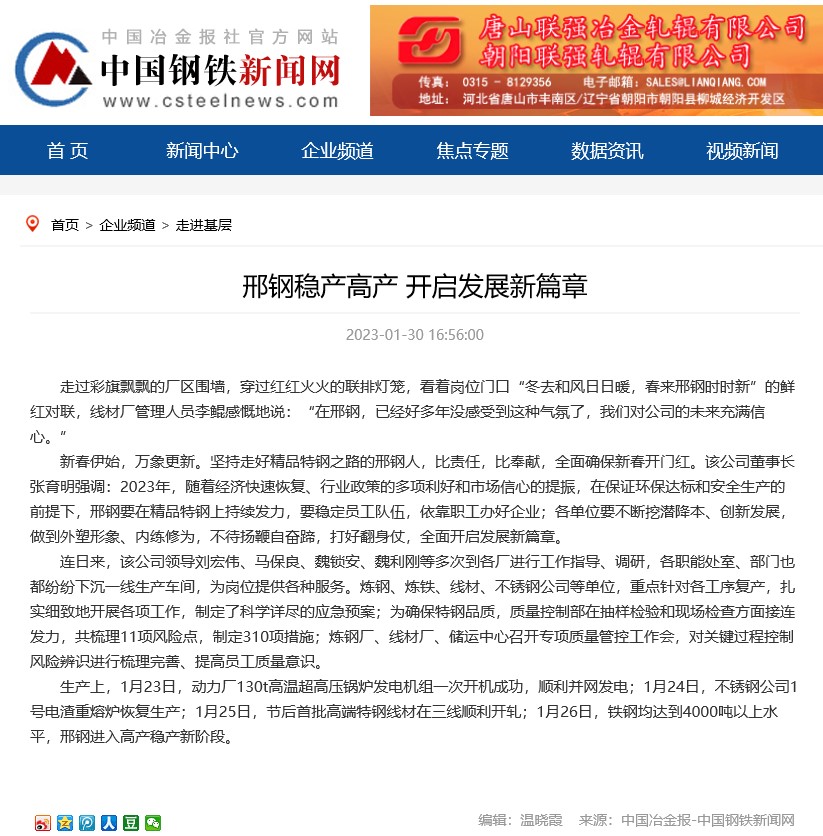 生產(chǎn)上,1月23日,動(dòng)力廠130t高溫超高壓鍋爐發(fā)電機(jī)組一次開機(jī)成功,順利并網(wǎng)發(fā)電;1月24日,不銹鋼公司1號(hào)電渣重熔爐恢復(fù)生產(chǎn);1月25日,節(jié)后首批高端特鋼線材在三線順利開軋;1月26日,鐵鋼均達(dá)到4000噸以上水平,邢鋼進(jìn)入高產(chǎn)穩(wěn)產(chǎn)新階段。