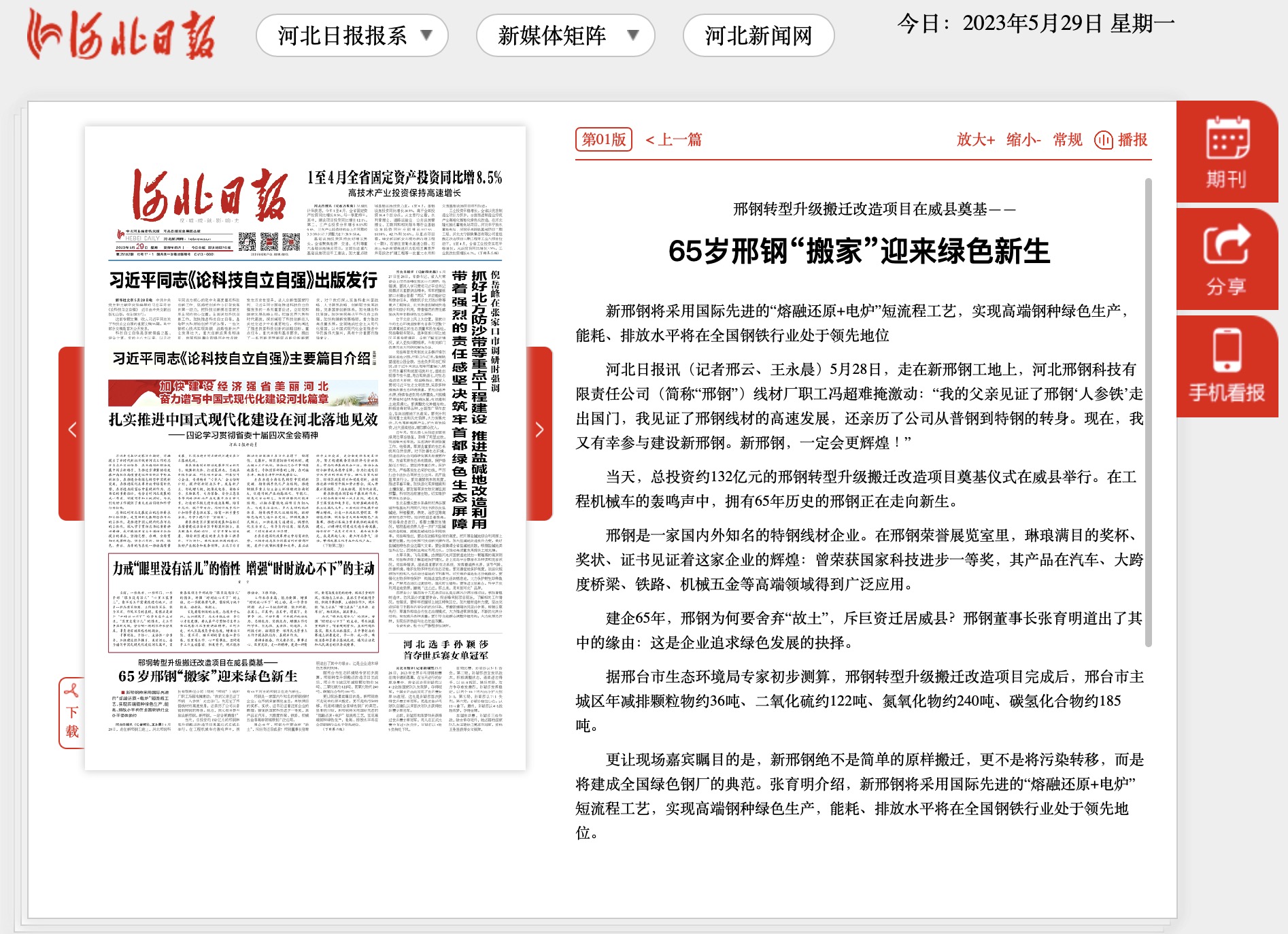 河北日?qǐng)?bào)訊(記者邢云、王永晨)5月28日,走在新邢鋼工地上,河北邢鋼科技有限責(zé)任公司(簡(jiǎn)稱“邢鋼”)線材廠職工馮超難掩激動(dòng):“我的父親見(jiàn)證了邢鋼‘人參鐵’走出國(guó)門(mén),我見(jiàn)證了邢鋼線材的高速發(fā)展,還親歷了公司從普鋼到特鋼的轉(zhuǎn)身。現(xiàn)在,我又有幸參與建設(shè)新邢鋼。新邢鋼,一定會(huì)更輝煌!”