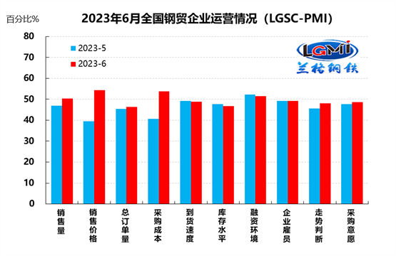 蘭格鋼鐵網(wǎng)統(tǒng)計發(fā)布的2023年6月份鋼鐵流通業(yè)PMI總指數(shù)為49.6%,比上月上升1.8個百分點,在收縮區(qū)間內(nèi)繼續(xù)回升。從分類指數(shù)看,構(gòu)成鋼鐵流通業(yè)PMI的10個分類指數(shù)6升3降1平,其中銷售量、銷售價格、總訂單量、采購成本、走勢判斷和采購意愿6項指數(shù)上升,到貨速度、庫存水平和融資環(huán)境3項指數(shù)下降,企業(yè)雇員1項指數(shù)持平。