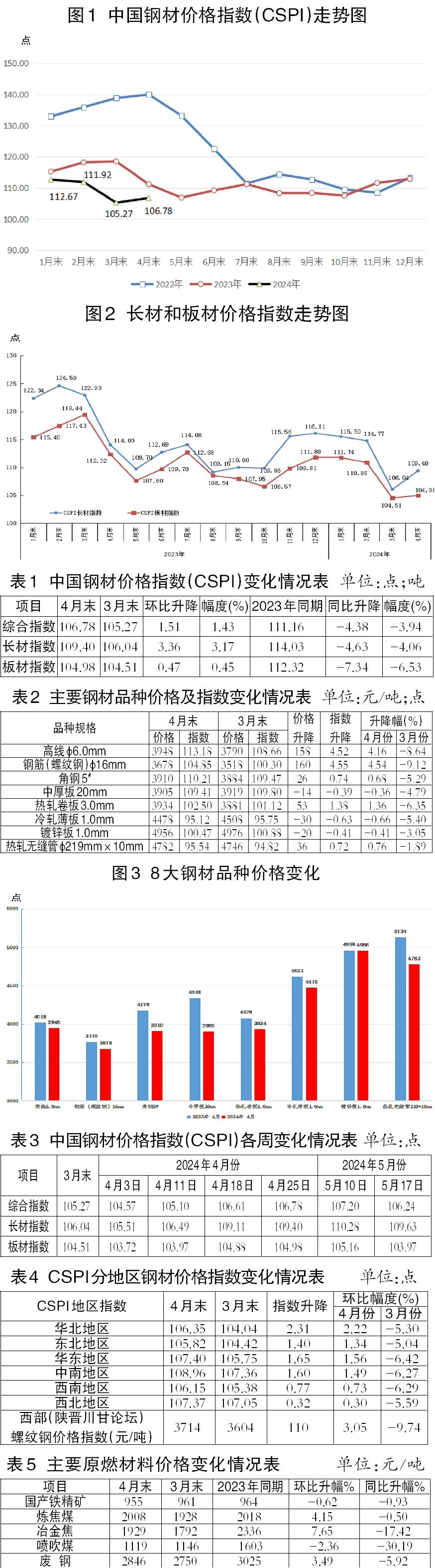 截至4月末,CSPI長材指數(shù)為109.40點(diǎn),環(huán)比上升3.36點(diǎn),升幅為3.17%;CSPI板材指數(shù)為104.98點(diǎn),環(huán)比上升0.47點(diǎn),升幅為0.45%;與上年同期相比,CSPI長材、板材指數(shù)分別下降4.63點(diǎn)和7.34點(diǎn),降幅分別為4.06%和6.53%。