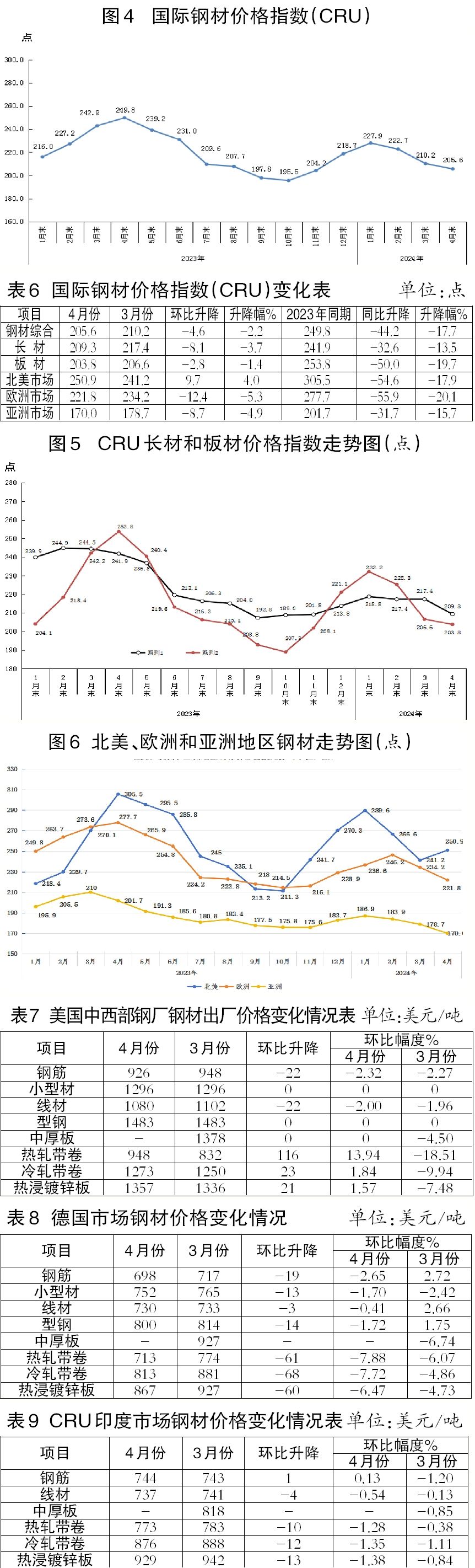 4月份,CRU國際鋼材價格指數(shù)為205.6點(diǎn),環(huán)比下降4.6點(diǎn),降幅為2.2%,連續(xù)3個月下降;同比下降44.2點(diǎn),降幅為17.7%。