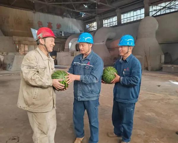 “天氣炎熱,大家辛苦了”,在爐前,侯副總親自把西瓜送到員工手里,并送上節(jié)日的祝福“端午安康!”希望大家在工作中注意做好防暑降溫,避免中暑,工作中合理分配體力,既要保證西場主溝澆筑過程安全,又要保證東場單場出鐵過程安全。在二燒混合機檢修現(xiàn)場,侯總了解檢修進度,叮囑維修、燒結(jié)車間主任,要注意檢修過程人員安全,保證檢修質(zhì)量,為二燒設(shè)備穩(wěn)定運行奠定基礎(chǔ)。