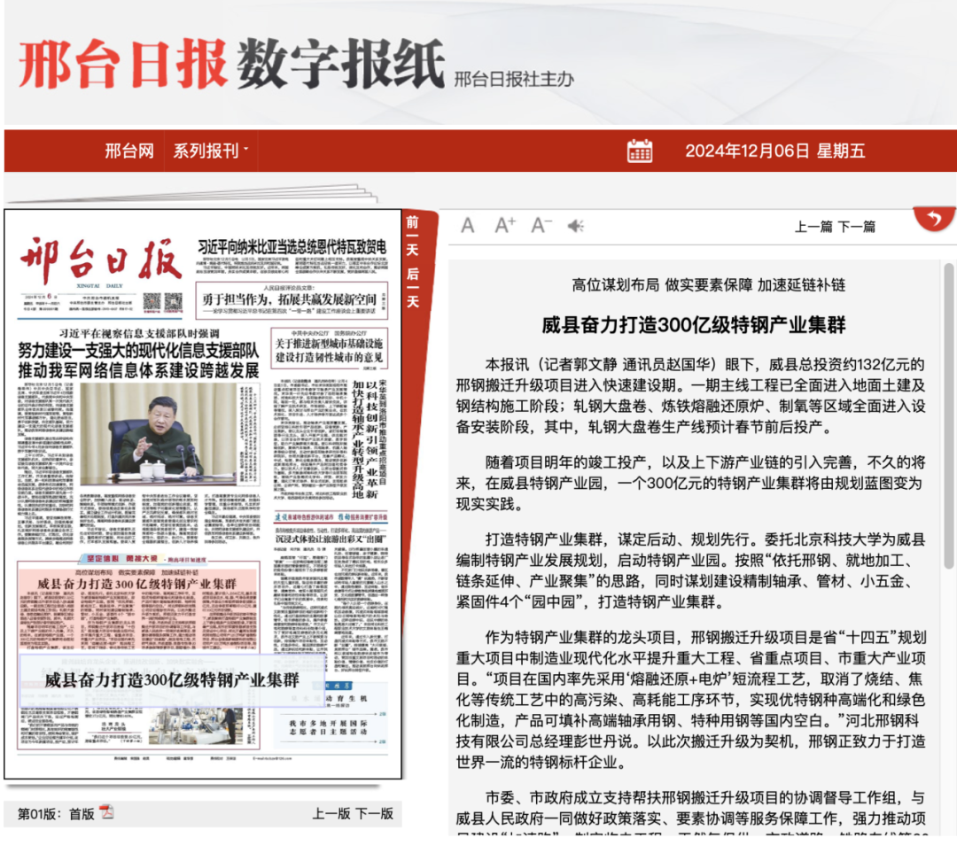 隨著項(xiàng)目明年的竣工投產(chǎn),以及上下游產(chǎn)業(yè)鏈的引入完善,不久的將來,在威縣特鋼產(chǎn)業(yè)園,一個300億元的特鋼產(chǎn)業(yè)集群將由規(guī)劃藍(lán)圖變?yōu)楝F(xiàn)實(shí)實(shí)踐。