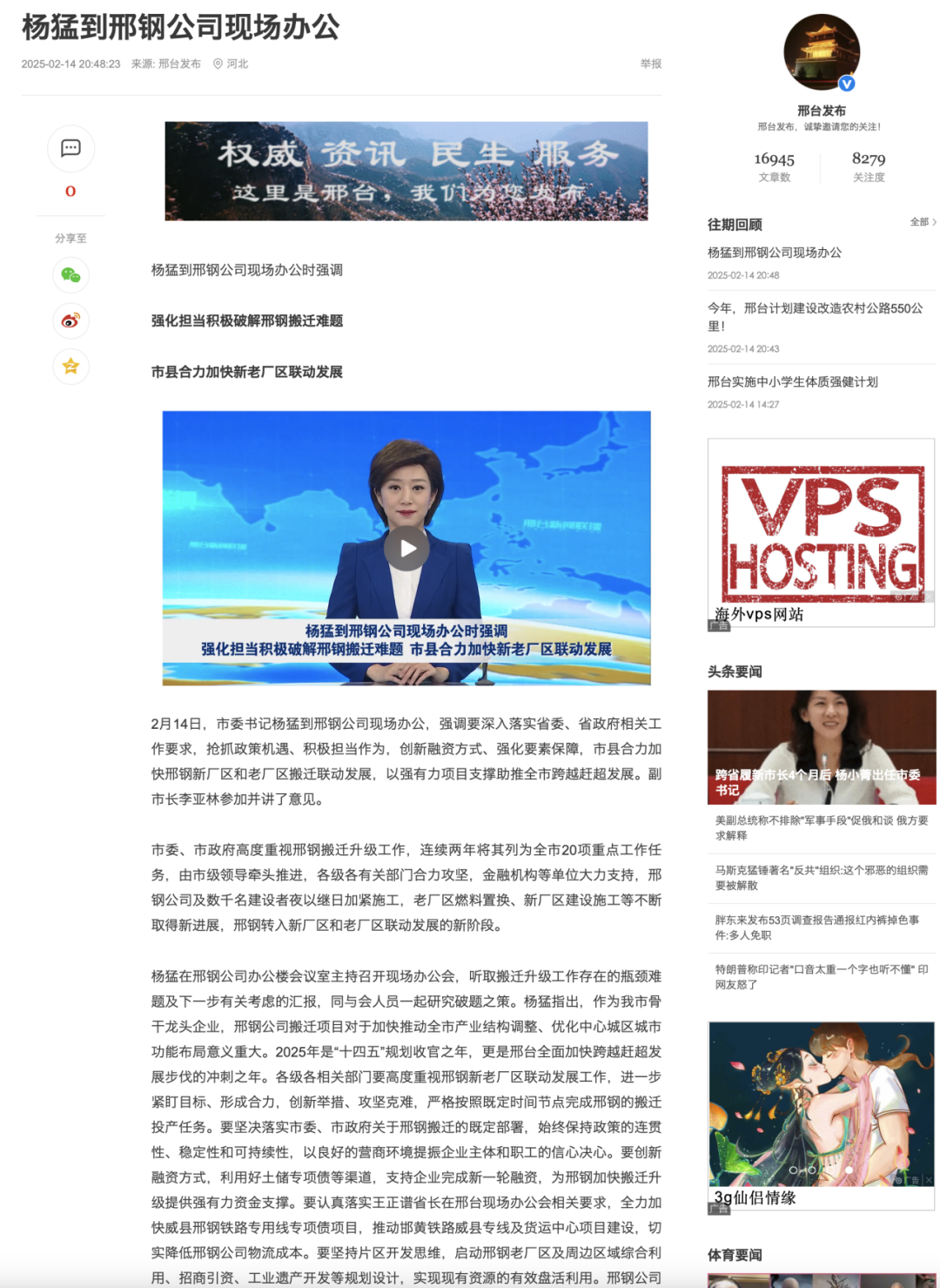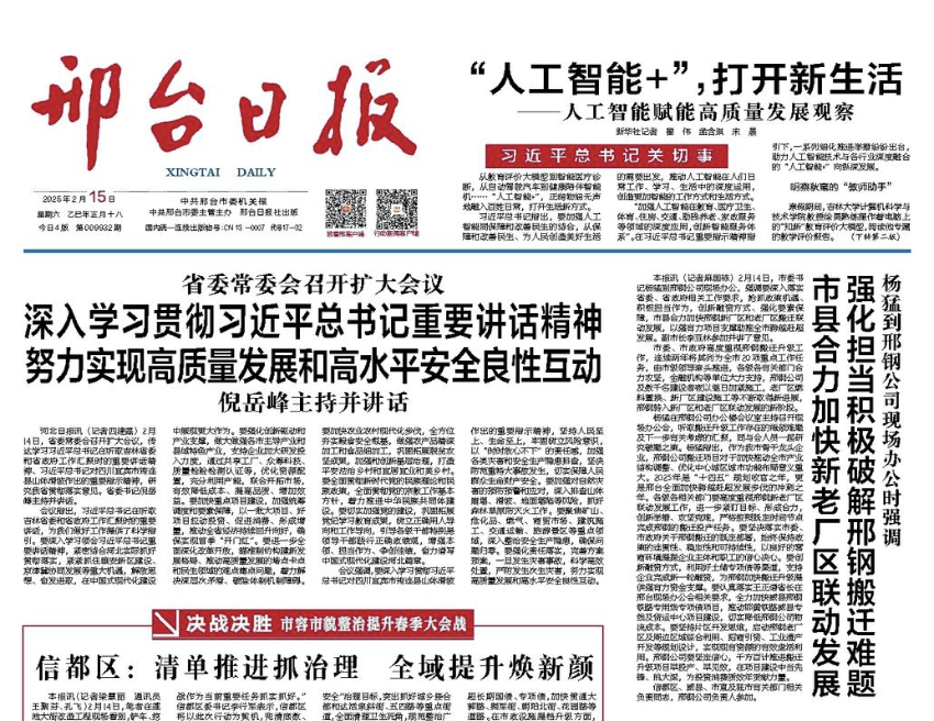 2月14日,市委書記楊猛到邢鋼公司現(xiàn)場辦公,強調(diào)要深入落實省委、省政府相關(guān)工作要求,搶抓政策機遇、積極擔(dān)當(dāng)作為,創(chuàng)新融資方式、強化要素保障,市縣合力加快邢鋼新廠區(qū)和老廠區(qū)搬遷聯(lián)動發(fā)展,以強有力項目支撐助推全市跨越趕超發(fā)展。副市長李亞林參加并講了意見。