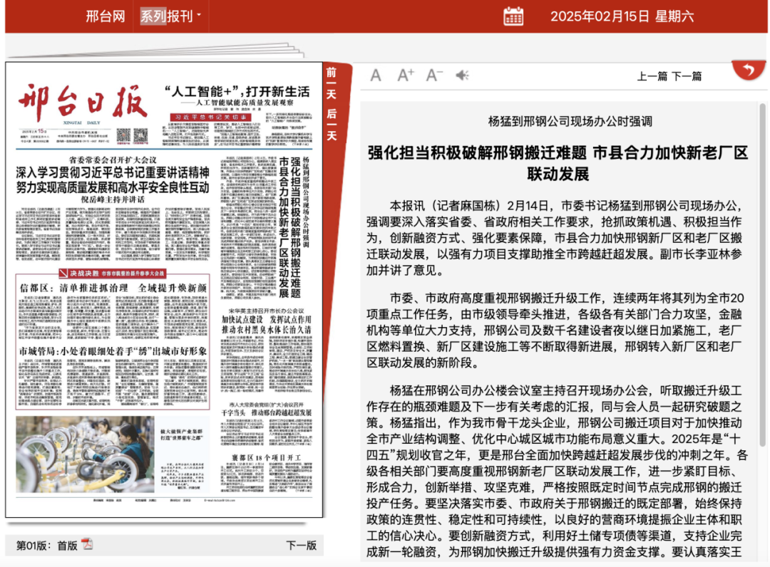 楊猛在邢鋼公司辦公樓會議室主持召開現(xiàn)場辦公會,聽取搬遷升級工作存在的瓶頸難題及下一步有關(guān)考慮的匯報,同與會人員一起研究破題之策。楊猛指出,作為我市骨干龍頭企業(yè),邢鋼公司搬遷項目對于加快推動全市產(chǎn)業(yè)結(jié)構(gòu)調(diào)整、優(yōu)化中心城區(qū)城市功能布局意義重大。2025年是“十四五”規(guī)劃收官之年,更是邢臺全面加快跨越趕超發(fā)展步伐的沖刺之年。各級各相關(guān)部門要高度重視邢鋼新老廠區(qū)聯(lián)動發(fā)展工作,進(jìn)一步緊盯目標(biāo)、形成合力,創(chuàng)新舉措、攻堅克難,嚴(yán)格按照既定時間節(jié)點完成邢鋼的搬遷投產(chǎn)任務(wù)。要堅決落實市委、市政府關(guān)于邢鋼搬遷的既定部署,始終保持政策的連貫性、穩(wěn)定性和可持續(xù)性,以良好的營商環(huán)境提振企業(yè)主體和職工的信心決心。要創(chuàng)新融資方式,利用好土儲專項債等渠道,支持企業(yè)完成新一輪融資,為邢鋼加快搬遷升級提供強有力資金支撐。要認(rèn)真落實王正譜省長在邢臺現(xiàn)場辦公會相關(guān)要求,全力加快威縣邢鋼鐵路專用線專項債項目,推動邯黃鐵路威縣專線及貨運中心項目建設(shè),切實降低邢鋼公司物流成本。要堅持片區(qū)開發(fā)思維,啟動邢鋼老廠區(qū)及周邊區(qū)域綜合利用、招商引資、工業(yè)遺產(chǎn)開發(fā)等規(guī)劃設(shè)計,實現(xiàn)現(xiàn)有資源的有效盤活利用。邢鋼公司要堅定信心,千方百計推進(jìn)搬遷升級項目早投產(chǎn)、早見效,在項目建設(shè)中當(dāng)先鋒、挑大梁,為投資消費質(zhì)效年貢獻(xiàn)力量。