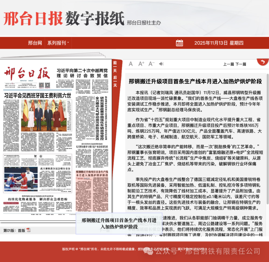 率先投產(chǎn)的大盤卷生產(chǎn)線整合了德國三輥減定徑軋機和美國普銳特卷取機等國際先進(jìn)裝備,采用智能加熱、低溫軋制、控軋控冷等多項特鋼軋制前沿工藝技術(shù),有效降低了線材加工成本,顯著提升了產(chǎn)品附加值。由其生產(chǎn)的特鋼產(chǎn)品,尺寸精度可穩(wěn)定控制在±0.1毫米以內(nèi),誤差尺寸約等于一根頭發(fā)絲的直徑。這些先進(jìn)技術(shù)與裝備的融合,讓邢鋼在特鋼生產(chǎn)的精度、效率和品質(zhì)上實現(xiàn)質(zhì)的飛躍,可滿足大規(guī)模生產(chǎn)特高級鋼種需求。“為了讓項目全速推進(jìn),我們從各職能部門抽調(diào)精干力量,成立服務(wù)專班,前期已為項目解決供水管道施工、周邊公路建設(shè)等一系列問題。”服務(wù)專班值班組長侯立中表示,他們將持續(xù)優(yōu)化服務(wù)流程,常態(tài)化開展“上門服務(wù)”“現(xiàn)場辦公”,實時跟蹤項目施工進(jìn)度,及時協(xié)調(diào)解決項目建設(shè)中的一線難題,保障項目按時間節(jié)點高效推進(jìn),早日建成投產(chǎn)。“眼下,我們正對標(biāo)國內(nèi)首鋼智新等先進(jìn)企業(yè),瞄準(zhǔn)高強度耐熱鋼等八大系列的高精尖產(chǎn)品,加大科技研發(fā)投入力度,全面提升產(chǎn)品附加值,實現(xiàn)高端化、綠色化、智能化升級,為我國高端裝備制造業(yè)提供關(guān)鍵材料支撐。”馬保良說。