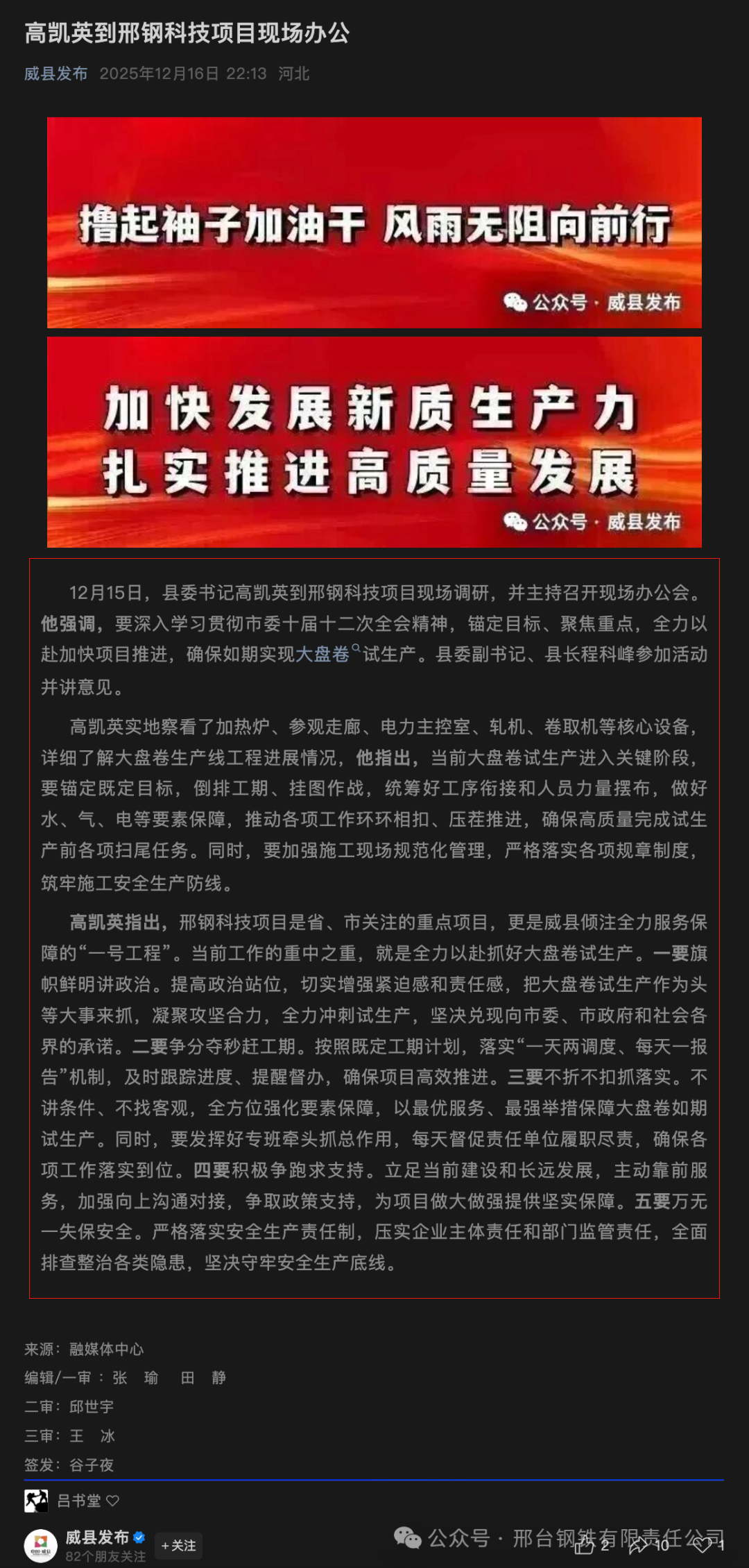 高凱英指出,邢鋼科技項目是省、市關(guān)注的重點項目,更是威縣傾注全力服務(wù)保障的“一號工程”。當(dāng)前工作的重中之重,就是全力以赴抓好大盤卷試生產(chǎn)。一要旗幟鮮明講政治。提高政治站位,切實增強緊迫感和責(zé)任感,把大盤卷試生產(chǎn)作為頭等大事來抓,凝聚攻堅合力,全力沖刺試生產(chǎn),堅決兌現(xiàn)向市委、市政府和社會各界的承諾。二要爭分奪秒趕工期。按照既定工期計劃,落實“一天兩調(diào)度、每天一報告”機制,及時跟蹤進度、提醒督辦,確保項目高效推進。三要不折不扣抓落實。不講條件、不找客觀,全方位強化要素保障,以最優(yōu)服務(wù)、最強舉措保障大盤卷如期試生產(chǎn)。同時,要發(fā)揮好專班牽頭抓總作用,每天督促責(zé)任單位履職盡責(zé),確保各項工作落實到位。四要積極爭跑求支持。立足當(dāng)前建設(shè)和長遠發(fā)展,主動靠前服務(wù),加強向上溝通對接,爭取政策支持,為項目做大做強提供堅實保障。五要萬無一失保安全。嚴(yán)格落實安全生產(chǎn)責(zé)任制,壓實企業(yè)主體責(zé)任和部門監(jiān)管責(zé)任,全面排查整治各類隱患,堅決守牢安全生產(chǎn)底線。